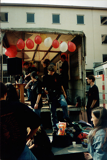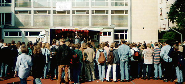 Im Hintergrund der “Toröffner”: Die (eingeweihte) Feuerwehr wurde dem Abi-Truck vorausgeschickt, damit der als äußerst misstrauisch bekannte Hausmeister das Tor zum Schulhof auf jeden Fall öffnen musste.